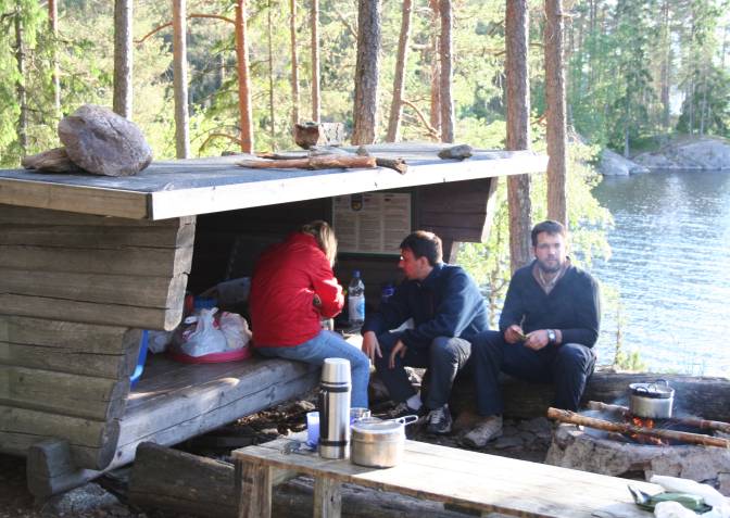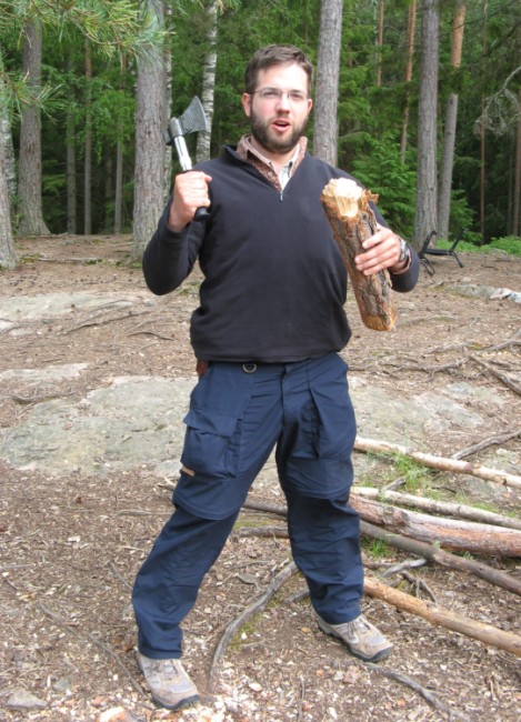 Hier sitzen wir gerade auf der Insel Trollön, die halb zu Norwegen und halb zu Schweden gehört (auf der schwedischen Seite). Oft hatten wir solche schönen Lagerplätze mit einer kleinen Schutzhütte und einer Feuerstelle. Feuerholz war meist zu finden, musste aber teilweise erst noch zerkleinert werden: