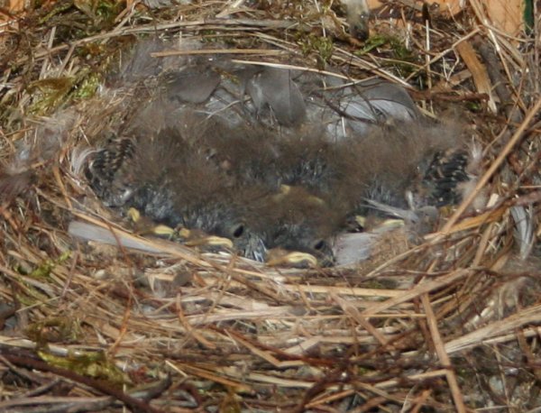 Wenn man genau hinguckt, erkennt man, dass das Nest keineswegs leer ist. Was man auf diesem Bild allerdings nicht erkennen kann, ist wo es sich befindet: Nämlich auf dem Plumsklo, so dass an diesem ein Schild „Außer Betrieb“ hing. |